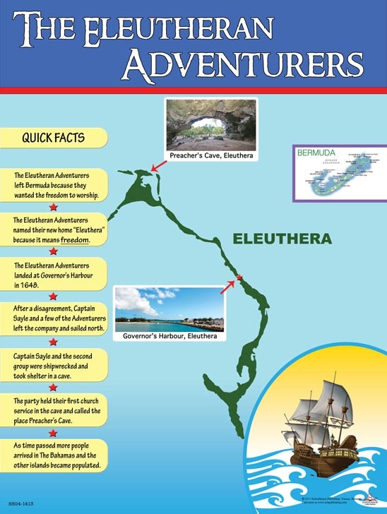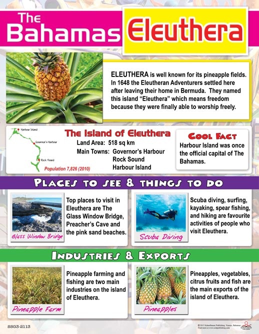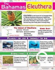 This beautiful and informative chart describes the island of Eleuthera. It provides information about industries, exports, tourist sights and more.