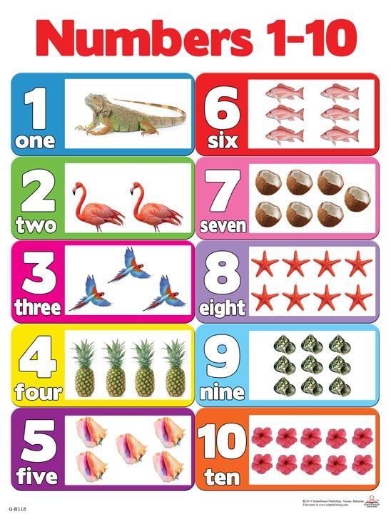 This chart helps students learn to identify the numbers 1-10 by using items found in the Bahamas.