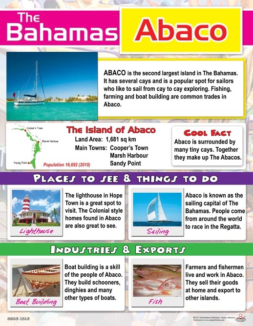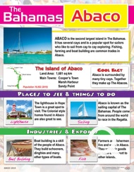 This beautiful and informative chart describes the island of Abaco. It provides information about industries, exports, tourist sights and more.
