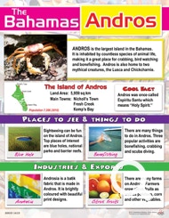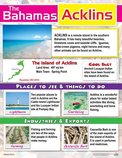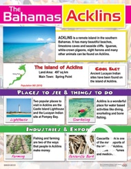 This beautiful and informative chart describes the island of Acklins. It provides information about industries, exports, tourist sights and more.