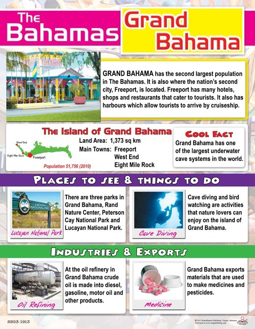 This beautiful and informative chart describes Grand Bahama. It provides information about industries, exports, tourist sights and more.