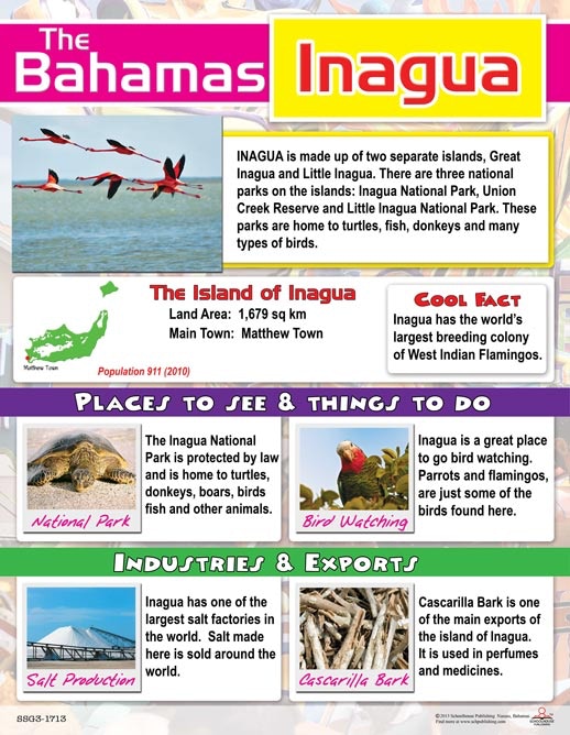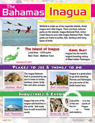 This beautiful and informative chart describes the island of Inagua. It provides information about industries, exports, tourist sights and more.