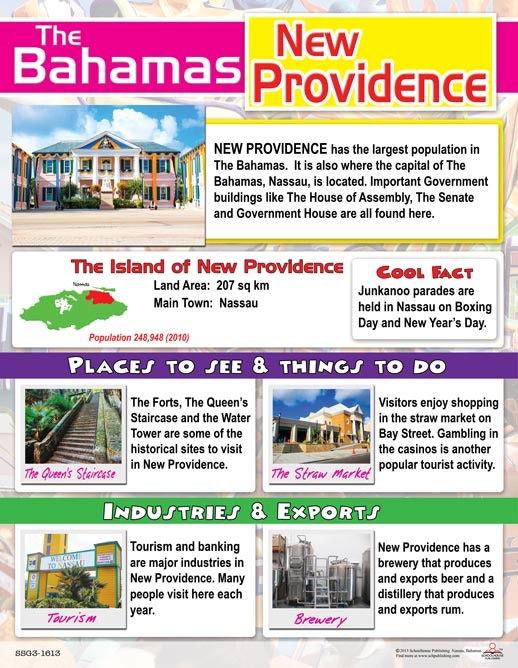 This beautiful and informative chart describes New Providence. It provides information about industries, exports, tourist sights and more.