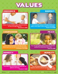 This chart shows highlights the values obedience, respect, compassion, peace, honesty, humility.
